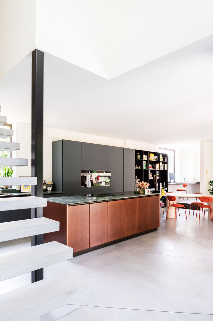 Wonderlijke make-over van vrijstaande oude woning uit familie voor de nieuwe generatie. Iets meer dan een muurtje uitbreken, levert een gans andere oriëntatie van de leefruimtes op, met connectie met de bomen rondom. Open ruimtes geven een luchtig gevoel met elk zijn plekgevoel. Thuiswerken geniet mee van de openheid, maar vanop een podium en deels verscholen.