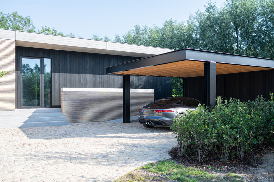 Onderstroombare modernistische bungalow tussen betonnen schijven. De ruime glaspartijen zorgen voor een grote interactie met de groene tuin. Deze beleving wordt versterkt door een sober en puur materiaalgebruik dat qua sfeer binnen-buiten doorloopt. Het evenwicht tussen beton, baksteen en hout zorgt voor een tijdloze warme rust. Houten balkenplafond, schuivende panelen, vast tapijt en gordijnen zorgen voor een aangenaam akoestisch klimaat.