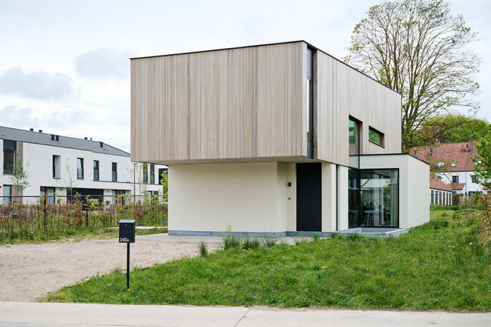 Een strakke nieuwbouw met een krachtig wit-zwart contrast, aangevuld met warme houtaccenten, zowel binnen als buiten. Het houten volume met een scheluw dak zorgt voor extra ruimtelijkheid in de open verdiepingsruimte.